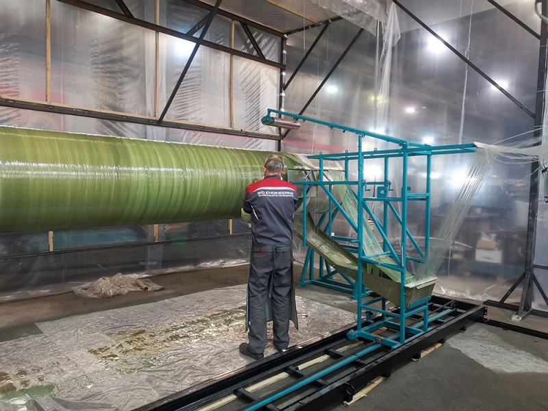 Технологическая линия филаментной намотки «Техкомпозит» предназначена для намотки, посредством подачи пропитанных полиэфирной смолой нитей стеклоровинга на вращающуюся оправку, стеклопластиковых композитных емкостей и труб, внутренним диаметром от 600 мм до 5300 мм с необходимой толщиной стенки и углами армирования (кольцевая, перекрестная).